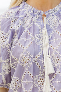 {"id":7382204481594,"title":"Talk It Through Lavender Embroidered Blouse","handle":"talk-it-through-lavender-embroidered-blouse","description":"\u003cp data-start=\"469\" data-end=\"835\" class=\"\"\u003eThis lavender beauty is a breath of fresh air! With its intricate white embroidery and playful tassel tie neckline, it's giving major summer-in-the-countryside vibes. The relaxed fit and fluttery sleeves make it a dream to wear with your favorite denim or linen pants. Add some golden sunshine and you're good to go!\u003c\/p\u003e\n\u003cul\u003e\n\u003cli data-start=\"837\" data-end=\"1169\"\u003eV-neckline with tied detail\u003c\/li\u003e\n\u003cli data-start=\"837\" data-end=\"1169\"\u003eShort bubble sleeves\u003c\/li\u003e\n\u003cli data-start=\"837\" data-end=\"1169\"\u003eEmbroidered eyelet fabric\u003c\/li\u003e\n\u003cli data-start=\"837\" data-end=\"1169\"\u003eMaterial has no amount of stretch\u003c\/li\u003e\n\u003c\/ul\u003e\n\u003cp\u003eBaileigh is wearing the small. \u003c\/p\u003e","published_at":"2025-05-13T08:00:12-04:00","created_at":"2025-02-19T13:13:25-05:00","vendor":"Shop the Mint","type":"","tags":["4thSale2025","BF.SSTops.Dresses.2025","BF.SSTops2025","bis-hidden","Clothing","Color_Purple","DetailedCategory_Blouse","DetailedCategory_Short Sleeve","Feature_Embroidered","Feature_Eyelet","In Stock","MainCategory_Tops","NA Date_05\/13\/2025","NON_NEW_ARRIVAL","Occasion_Everyday","Occasion_Work","Price_$50.00 - $74.99","Product Photos","Regular Price","Season_Summer","Site Visible","Size_Large","Size_Small","sub25","Teachers","Tops","Womens"],"price":6900,"price_min":6900,"price_max":6900,"available":true,"price_varies":false,"compare_at_price":null,"compare_at_price_min":0,"compare_at_price_max":0,"compare_at_price_varies":false,"variants":[{"id":40785781915706,"title":"Small \/ Lavender","option1":"Small","option2":"Lavender","option3":null,"sku":"116752-PUR-SM","requires_shipping":true,"taxable":true,"featured_image":null,"available":true,"name":"Talk It Through Lavender Embroidered Blouse - Small \/ Lavender","public_title":"Small \/ Lavender","options":["Small","Lavender"],"price":6900,"weight":159,"compare_at_price":null,"inventory_management":"shopify","barcode":"116752-PUR-SM","requires_selling_plan":false,"selling_plan_allocations":[],"quantity_rule":{"min":1,"max":null,"increment":1}},{"id":40785781948474,"title":"Medium \/ Lavender","option1":"Medium","option2":"Lavender","option3":null,"sku":"116752-PUR-MD","requires_shipping":true,"taxable":true,"featured_image":null,"available":false,"name":"Talk It Through Lavender Embroidered Blouse - Medium \/ Lavender","public_title":"Medium \/ Lavender","options":["Medium","Lavender"],"price":6900,"weight":181,"compare_at_price":null,"inventory_management":"shopify","barcode":"116752-PUR-MD","requires_selling_plan":false,"selling_plan_allocations":[],"quantity_rule":{"min":1,"max":null,"increment":1}},{"id":40785781981242,"title":"Large \/ Lavender","option1":"Large","option2":"Lavender","option3":null,"sku":"116752-PUR-LG","requires_shipping":true,"taxable":true,"featured_image":null,"available":true,"name":"Talk It Through Lavender Embroidered Blouse - Large \/ Lavender","public_title":"Large \/ Lavender","options":["Large","Lavender"],"price":6900,"weight":204,"compare_at_price":null,"inventory_management":"shopify","barcode":"116752-PUR-LG","requires_selling_plan":false,"selling_plan_allocations":[],"quantity_rule":{"min":1,"max":null,"increment":1}}],"images":["\/\/shopthemint.com\/cdn\/shop\/files\/116752.Talk-It-Through-Lavender-Embroidered-Blouse__copy_4.jpg?v=1747075607","\/\/shopthemint.com\/cdn\/shop\/files\/116752.Talk-It-Through-Lavender-Embroidered-Blouse__copy_3.jpg?v=1747075607","\/\/shopthemint.com\/cdn\/shop\/files\/116752.Talk-It-Through-Lavender-Embroidered-Blouse.jpg?v=1747075532","\/\/shopthemint.com\/cdn\/shop\/files\/116752.Talk-It-Through-Lavender-Embroidered-Blouse__copy_1.jpg?v=1747075532","\/\/shopthemint.com\/cdn\/shop\/files\/116752.Talk-It-Through-Lavender-Embroidered-Blouse__copy_2.jpg?v=1747075532"],"featured_image":"\/\/shopthemint.com\/cdn\/shop\/files\/116752.Talk-It-Through-Lavender-Embroidered-Blouse__copy_4.jpg?v=1747075607","options":["Size","Color"],"media":[{"alt":null,"id":22940365094970,"position":1,"preview_image":{"aspect_ratio":0.667,"height":3000,"width":2000,"src":"\/\/shopthemint.com\/cdn\/shop\/files\/116752.Talk-It-Through-Lavender-Embroidered-Blouse__copy_4.jpg?v=1747075607"},"aspect_ratio":0.667,"height":3000,"media_type":"image","src":"\/\/shopthemint.com\/cdn\/shop\/files\/116752.Talk-It-Through-Lavender-Embroidered-Blouse__copy_4.jpg?v=1747075607","width":2000},{"alt":null,"id":22940365062202,"position":2,"preview_image":{"aspect_ratio":0.667,"height":3000,"width":2000,"src":"\/\/shopthemint.com\/cdn\/shop\/files\/116752.Talk-It-Through-Lavender-Embroidered-Blouse__copy_3.jpg?v=1747075607"},"aspect_ratio":0.667,"height":3000,"media_type":"image","src":"\/\/shopthemint.com\/cdn\/shop\/files\/116752.Talk-It-Through-Lavender-Embroidered-Blouse__copy_3.jpg?v=1747075607","width":2000},{"alt":null,"id":22940365127738,"position":3,"preview_image":{"aspect_ratio":0.667,"height":3000,"width":2000,"src":"\/\/shopthemint.com\/cdn\/shop\/files\/116752.Talk-It-Through-Lavender-Embroidered-Blouse.jpg?v=1747075532"},"aspect_ratio":0.667,"height":3000,"media_type":"image","src":"\/\/shopthemint.com\/cdn\/shop\/files\/116752.Talk-It-Through-Lavender-Embroidered-Blouse.jpg?v=1747075532","width":2000},{"alt":null,"id":22940365160506,"position":4,"preview_image":{"aspect_ratio":0.667,"height":3000,"width":2000,"src":"\/\/shopthemint.com\/cdn\/shop\/files\/116752.Talk-It-Through-Lavender-Embroidered-Blouse__copy_1.jpg?v=1747075532"},"aspect_ratio":0.667,"height":3000,"media_type":"image","src":"\/\/shopthemint.com\/cdn\/shop\/files\/116752.Talk-It-Through-Lavender-Embroidered-Blouse__copy_1.jpg?v=1747075532","width":2000},{"alt":null,"id":22940365193274,"position":5,"preview_image