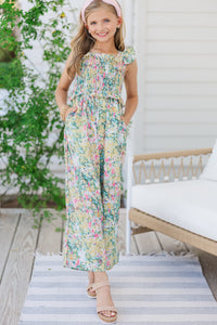Girls: All For You Yellow Abstract Floral Smocked Jumpsuit